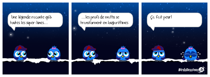Case 1:Bird 1: Une légende raconte qu'à toutes les super-lunes... | Case 2: Bird 1: ...les profs de maths se transforment en lougarithmes | Case 3: Bird 1: Ça fait peur!