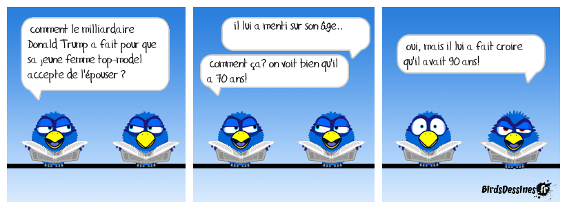 Case 1:Bird 1: comment le milliardaire Donald Trump a fait pour que sa jeune femme top-model accepte de l'épouser ? | Case 2: Bird 1: il lui a menti sur son âge.. Bird 2: comment ça? on voit bien qu'il a 70 ans! | Case 3: Bird 1: oui, mais il lui a fait croire qu'il avait 90 ans!