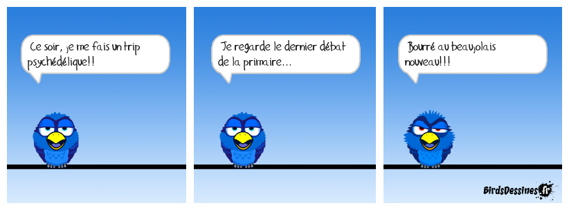Case 1:Bird 1: Ce soir, je me fais un trip psychédélique!! | Case 2: Bird 1: Je regarde le dernier débat de la primaire... | Case 3: Bird 1: Bourré au beaujolais nouveau!!!