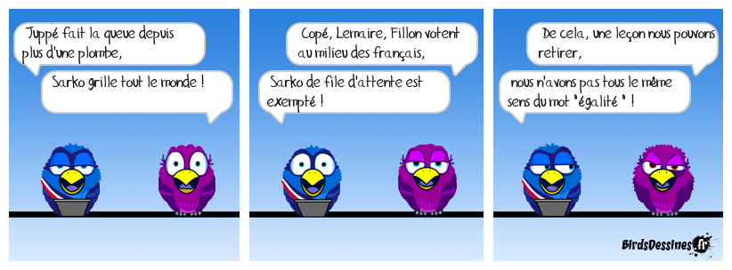 Case 1:Bird 1: Juppé fait la queue depuis plus d'une plombe, Bird 2: Sarko grille tout le monde ! | Case 2: Bird 1: Copé, Lemaire, Fillon votent au milieu des français, Bird 2: Sarko de file d'attente est exempté ! | Case 3: Bird 1: De cela, une leçon nous pouvons retirer, Bird 2: nous n'avons pas tous le même sens du mot "égalité " !