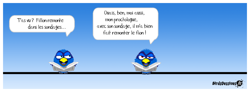 Case 1:Bird 1: T'as vu ? Fillon remonte dans les sondages... | Case 2: Bird 1: Ouais, ben, moi aussi, mon proctologue, avec son sondage, il m'a bien fait remonter le fion ! | Case 3: