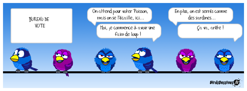Case 1:Bird 1: BUREAU DE VOTE | Case 2: Bird 1: On attend pour voter Poisson, mais on se l'écaille, ici... Bird 2: Moi, je commence à avoir une faim de loup ! | Case 3: Bird 1: En plus, on est serrés comme des sardines... Bird 2: Ça va, arête !