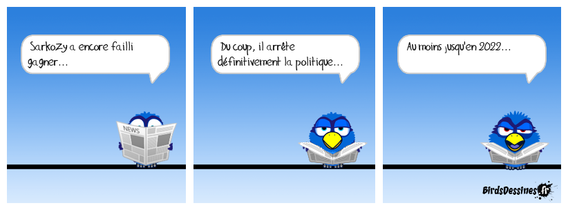Case 1:Bird 1: Sarkozy a encore failli gagner... | Case 2: Bird 1: Du coup, il arrête définitivement la politique... | Case 3: Bird 1: Au moins jusqu'en 2022...