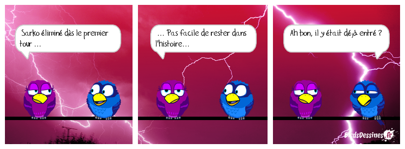 Case 1:Bird 1: Sarko éliminé dès le premier tour ... | Case 2: Bird 1: ... Pas facile de rester dans l'histoire... | Case 3: Bird 1: Ah bon, il y était déjà entré ?
