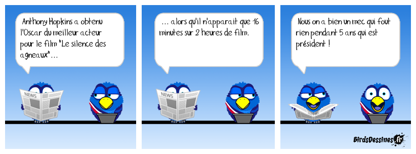 Case 1:Bird 1: Anthony Hopkins a obtenu l'Oscar du meilleur acteur pour le film "Le silence des agneaux"... | Case 2: Bird 1: ... alors qu'il n'apparait que 16 minutes sur 2 heures de film. | Case 3: Bird 1: Nous on a bien un mec qui fout rien pendant 5 ans qui est président !