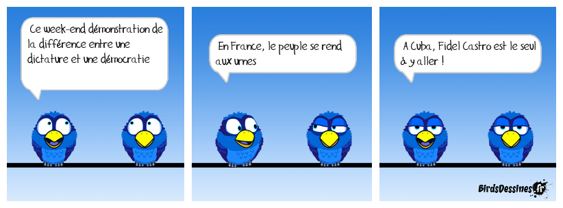 Case 1:Bird 1: Ce week-end démonstration de la différence entre une dictature et une démocratie | Case 2: Bird 1: En France, le peuple se rend aux urnes | Case 3: Bird 1: A Cuba, Fidel Castro est le seul à y aller !
