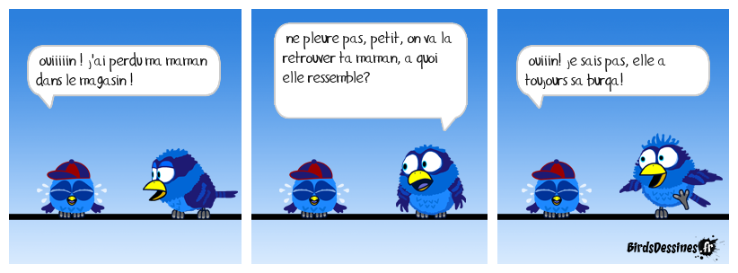 Case 1:Bird 1: ouiiiiin ! j'ai perdu ma maman dans le magasin ! | Case 2: Bird 1: ne pleure pas, petit, on va la retrouver ta maman, a quoi elle ressemble? | Case 3: Bird 1: ouiiin! je sais pas, elle a toujours sa burqa!