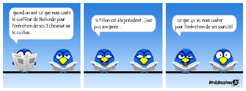 Case 1:Bird 1: quand on voit ce que nous coute le coiffeur de Hollande pour l'entretien de ses 3 cheveux sur le caillou.. | Case 2: Bird 1: si Fillon est élu président, j'ose pas imaginer.. | Case 3: Bird 1: ce que ça va nous couter pour l'entretien de ses sourcils!
