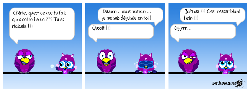 Case 1:Bird 1: Chérie, qu'est ce que tu fais dans cette tenue ??? Tu es ridicule !!! | Case 2: Bird 1: Ouuiinn... mais maman ... je me suis déguisée en toi ! Bird 2: Quooiii!!! | Case 3: Bird 1: Bah oui !!! C'est ressemblant hein !!! Bird 2: Gggrrr...