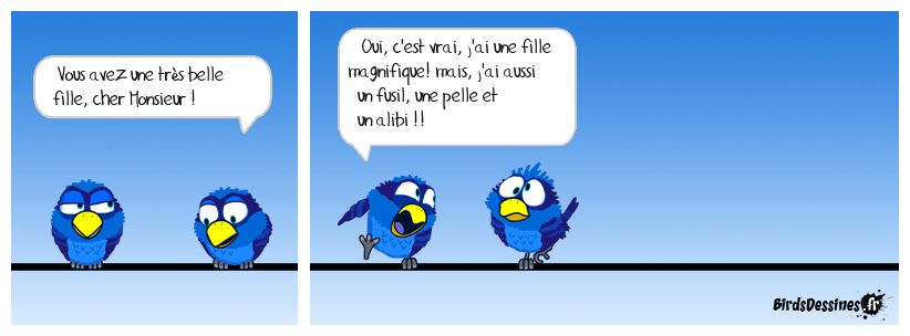 Case 1:Bird 1: Vous avez une très belle fille, cher Monsieur ! | Case 2: Bird 1: Oui, c'est vrai, j'ai une fille magnifique! mais, j'ai aussi un fusil, une pelle et un alibi !! | Case 3: