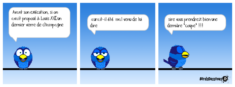 Case 1:Bird 1: Avant son exécution, si on avait proposé à Louis XVI un dernier verre de champagne | Case 2: Bird 1: aurait-il été mal venu de lui dire | Case 3: Bird 1: sire vous prendrez bien une dernière "coupe" !!!