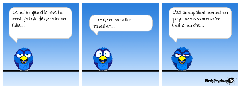 Case 1:Bird 1: Ce matin, quand le réveil a sonné, j'ai décidé de faire une folie... | Case 2: Bird 1: ...et de ne pas aller travailler... | Case 3: Bird 1: C'est en appelant mon patron que je me suis souvenu qu'on était dimanche...