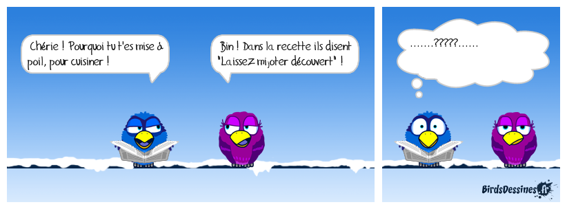 Case 1:Bird 1: Chérie ! Pourquoi tu t'es mise à poil, pour cuisiner ! | Case 2: Bird 1: Bin ! Dans la recette ils disent "Laissez mijoter découvert" ! | Case 3: Bird 1: .......?????......