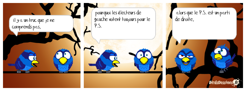 Case 1:Bird 1: il y a un truc que je ne comprends pas, | Case 2: Bird 1: pourquoi les électeurs de gauche votent toujours pour le P.S. | Case 3: Bird 1: alors que le P.S. est un parti de droite,