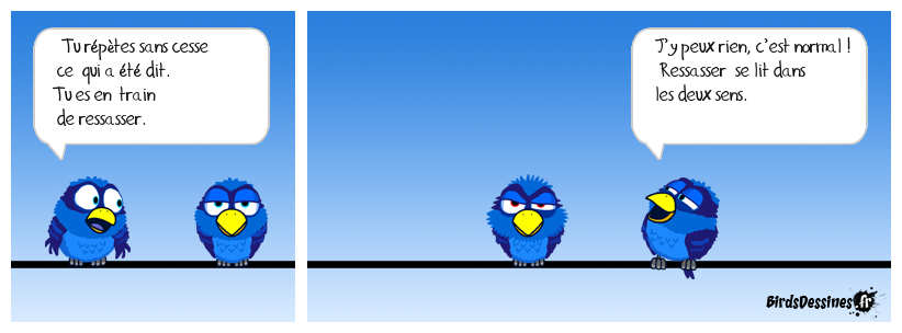 Case 1:Bird 1: Tu répètes sans cesse ce qui a été dit. Tu es en train de ressasser. | Case 2: | Case 3: Bird 1: J’y peux rien, c’est normal ! Ressasser se lit dans les deux sens.
