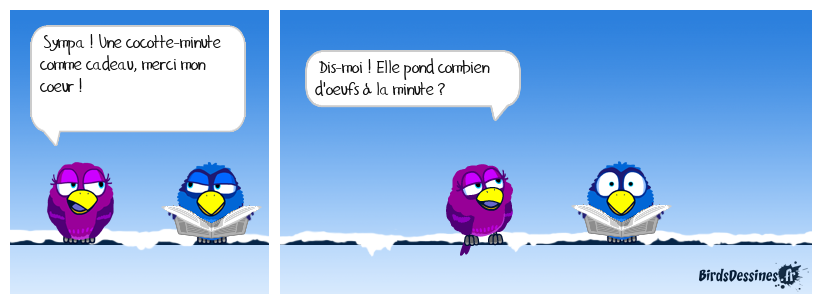 Case 1:Bird 1: Sympa ! Une cocotte-minute comme cadeau, merci mon coeur ! | Case 2: Bird 1: Dis-moi ! Elle pond combien d'oeufs à la minute ? | Case 3: