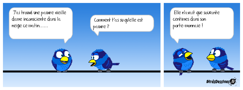 Case 1:Bird 1: J'ai trouvé une pauvre vieille dame inconsciente dans la neige ce matin...... | Case 2: Bird 1: Comment t'as su qu'elle est pauvre ? | Case 3: Bird 1: Elle n'avait que soixante centimes dans son porte-monnaie !