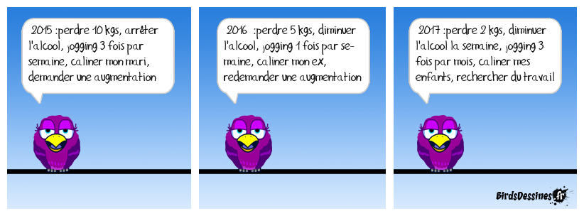Case 1:Bird 1: 2015 :perdre 10 kgs, arrêter l'alcool, jogging 3 fois par semaine, caliner mon mari, demander une augmentation | Case 2: Bird 1: 2016 :perdre 5 kgs, diminuer l'alcool, jogging 1 fois par se- maine, caliner mon ex, redemander une augmentation | Case 3: Bird 1: 2017 :perdre 2 kgs, diminuer l'alcool la semaine, jogging 3 fois par mois, caliner mes enfants, rechercher du travail