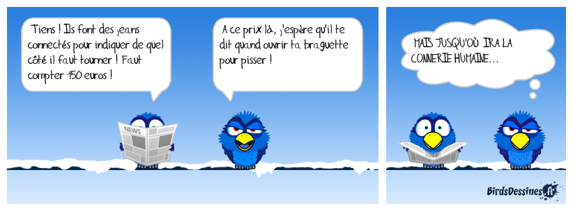 Case 1:Bird 1: Tiens ! Ils font des jeans connectés pour indiquer de quel côté il faut tourner ! Faut compter 150 euros ! | Case 2: Bird 1: A ce prix là, j'espère qu'il te dit quand ouvrir ta braguette pour pisser ! | Case 3: Bird 1: MAIS JUSQU'OÙ IRA LA CONNERIE HUMAINE...