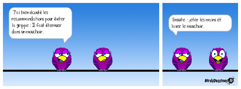 Case 1:Bird 1: J'ai bien écouté les recommandations pour éviter la grippe : Il faut éternuer dans un mouchoir. | Case 2: | Case 3: Bird 1: Ensuite : jeter les mains et laver le mouchoir.