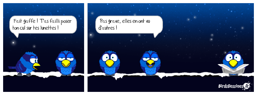Case 1:Bird 1: Fait gaffe ! T'as failli poser ton cul sur tes lunettes ! | Case 2: Bird 1: Pas grave, elles en ont vu d'autres ! | Case 3: