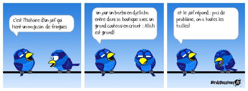 Case 1:Bird 1: c'est l'histoire d'un juif qui tient un magasin de fringues | Case 2: Bird 1: un jour un barbu en djellaba entre dans sa boutique avec un grand couteau en criant : Allah est grand! | Case 3: Bird 1: et le juif répond : pas de problème, on a toutes les tailles!