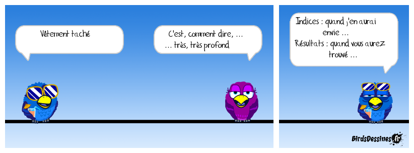 Case 1:Bird 1: Vêtement taché | Case 2: Bird 1: C'est, comment dire, ... ... très, très profond | Case 3: Bird 1: Indices : quand j'en aurai envie ... Résultats : quand vous aurez trouvé ...