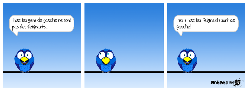 Case 1:Bird 1: tous les gens de gauche ne sont pas des feignants.. | Case 2: Bird 1: | Case 3: Bird 1: mais tous les feignants sont de gauche!