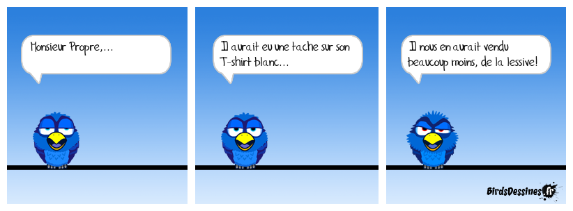 Case 1:Bird 1: Monsieur Propre,... | Case 2: Bird 1: Il aurait eu une tache sur son T-shirt blanc... | Case 3: Bird 1: Il nous en aurait vendu beaucoup moins, de la lessive!