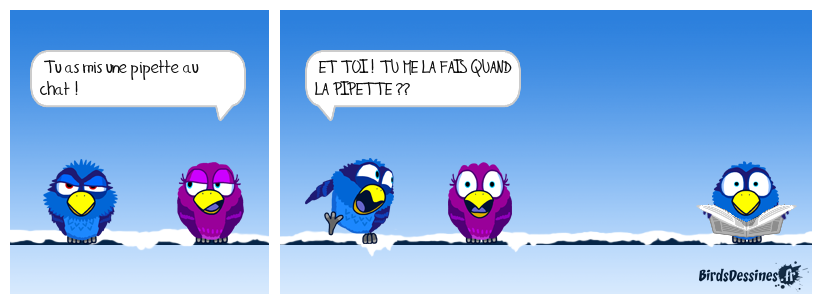 Case 1:Bird 1: Tu as mis une pipette au chat ! | Case 2: Bird 1: ET TOI ! TU ME LA FAIS QUAND LA PIPETTE ?? | Case 3: