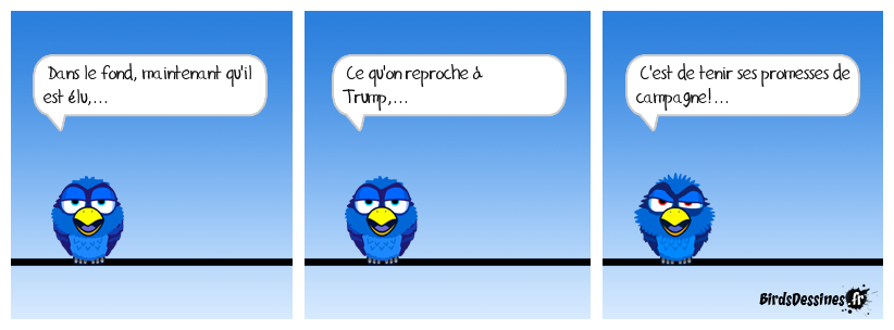 Case 1:Bird 1: Dans le fond, maintenant qu'il est élu,... | Case 2: Bird 1: Ce qu'on reproche à Trump,... | Case 3: Bird 1: C'est de tenir ses promesses de campagne!...