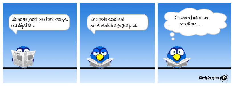 Case 1:Bird 1: Ils ne gagnent pas tant que ça, nos députés... | Case 2: Bird 1: Un simple assistant parlementaire gagne plus... | Case 3: Bird 1: Y'a quand même un . problème....