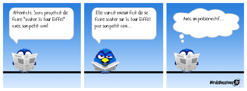 Case 1:Bird 1: Attentats: Sara projetait de faire "sauter la tour Eiffel" avec son petit ami! | Case 2: Bird 1: Elle aurait mieux fait de se faire sauter sur la tour Eiffel par son petit ami... | Case 3: Bird 1: Avec un préservatif...