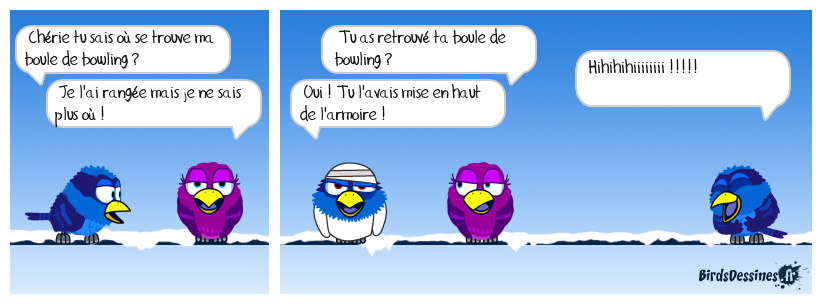 Case 1:Bird 1: Chérie tu sais où se trouve ma boule de bowling ?Bird 2: Je l'ai rangée mais je ne sais plus où ! | Case 2: Bird 1: Tu as retrouvé ta boule de bowling ? Bird 2: Oui ! Tu l'avais mise en haut de l'armoire ! | Case 3: Bird 1: Hihihihiiiiiiii !!!!!