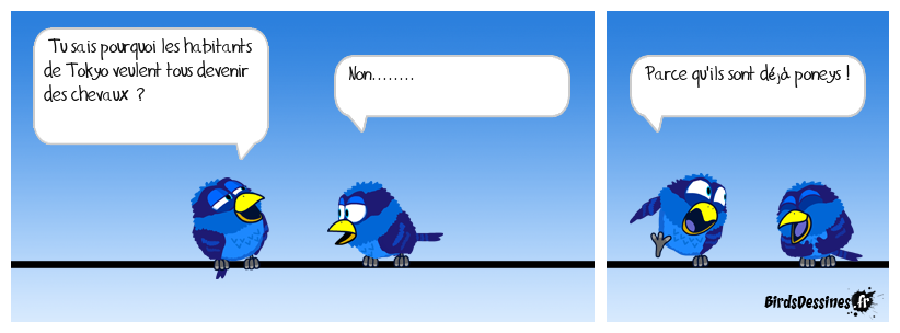 Case 1:Bird 1: Tu sais pourquoi les habitants de Tokyo veulent tous devenir des chevaux ? | Case 2: Bird 1: Non........ | Case 3: Bird 1: Parce qu'ils sont déjà poneys !