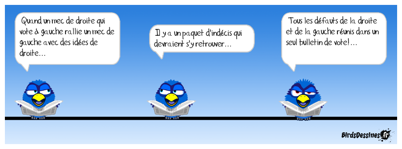 Case 1:Bird 1: Quand un mec de droite qui vote à gauche rallie un mec de gauche avec des idées de droite... | Case 2: Bird 1: Il y a un paquet d'indécis qui devraient s'y retrouver... | Case 3: Bird 1: Tous les défauts de la droite et de la gauche réunis dans un seul bulletin de vote!...