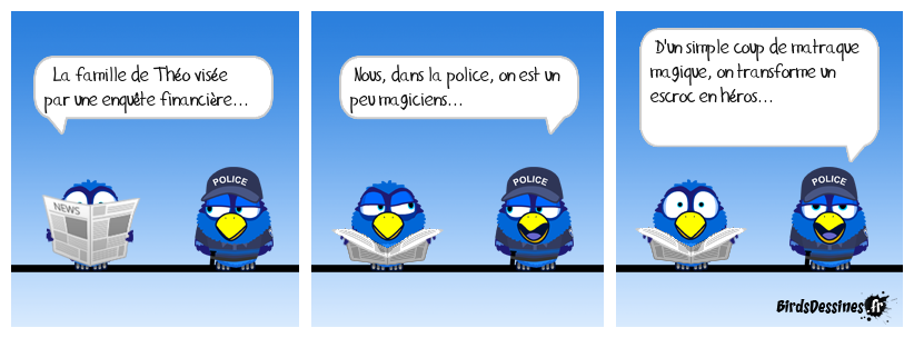 Case 1:Bird 1: La famille de Théo visée par une enquête financière... | Case 2: Bird 1: Nous, dans la police, on est un peu magiciens... | Case 3: Bird 1: D'un simple coup de matraque magique, on transforme un escroc en héros...