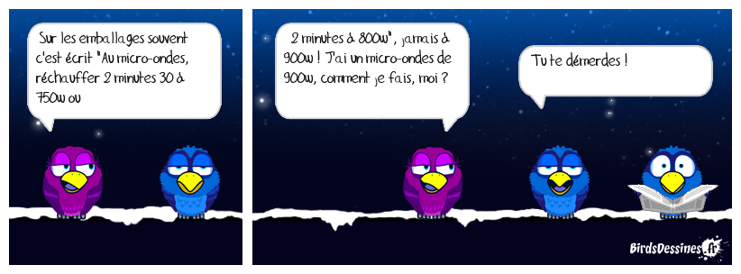 Case 1:Bird 1: Sur les emballages souvent c'est écrit "Au micro-ondes, réchauffer 2 minutes 30 à 750w ou | Case 2: Bird 1: 2 minutes à 800w", jamais à 900w ! J'ai un micro-ondes de 900w, comment je fais, moi ? | Case 3: Bird 1: Tu te démerdes !