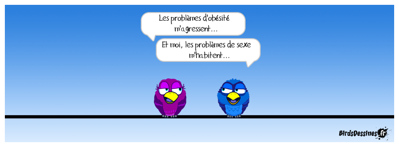 Case 1: | Case 2: Bird 1: Les problèmes d'obésité m'agressent... Bird 2: Et moi, les problèmes de sexe m'habitent... | Case 3: