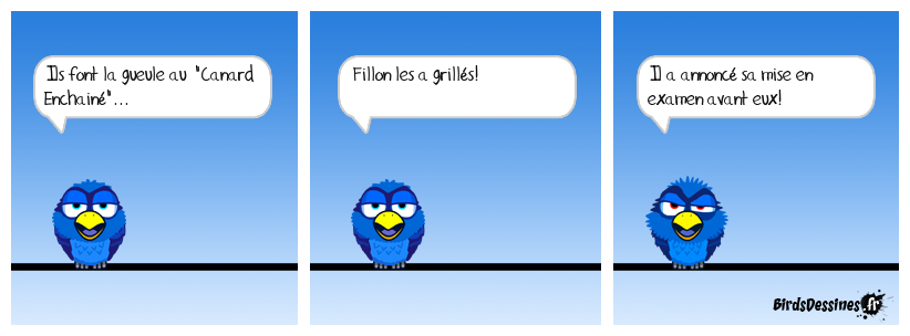 Case 1:Bird 1: Ils font la gueule au "Canard Enchainé"... | Case 2: Bird 1: Fillon les a grillés! | Case 3: Bird 1: Il a annoncé sa mise en examen avant eux!