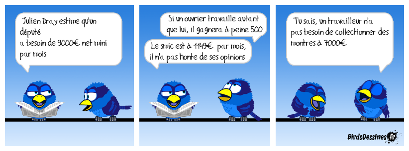 Case 1:Bird 1: Julien Dray estime qu'un député a besoin de 9000€ net mini par mois | Case 2: Bird 1: Si un ouvrier travaille autant que lui, il gagnera à peine 500 € Bird 2: Le smic est à 1149€ par mois, il n'a pas honte de ses opinions | Case 3: Bird 1: Tu sais, un travailleur n'a pas besoin de collectionner des montres à 7000€