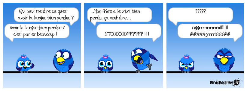 Case 1:Bird 1: Qui peut me dire ce qu'est avoir la langue bien pendue ?Bird 2: Avoir la langue bien pendue ? c'est parler beaucoup ! | Case 2: Bird 1: ..Mon frère a le zizi bien pendu, ça veut dire... Bird 2: STOOOOOOPPPPPP !!! | Case 3: Bird 1: ????? Bird 2: Gggrrrmmmmmlllllll ##%%%grrrr%%%##