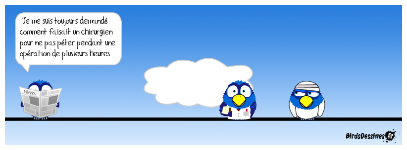 Case 1:Bird 1: Je me suis toujours demandé comment faisait un chirurgien pour ne pas péter pendant une opération de plusieurs heures | Case 2: | Case 3: