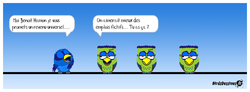 Case 1:Bird 1: Moi Benoit Hamon je vous promets un revenu universel.... | Case 2: Bird 1: On aimerait mieux des emplois fictifs... Tu as ça ? | Case 3: