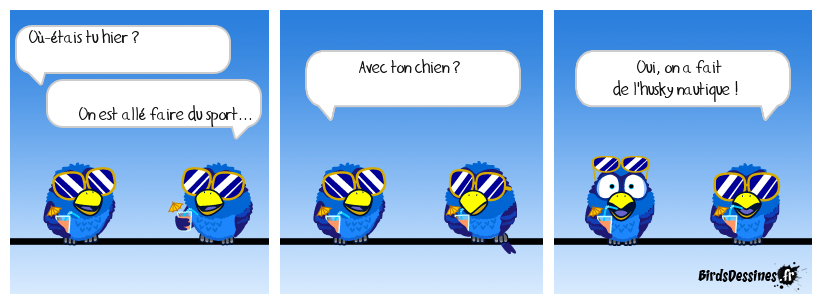 Case 1:Bird 1: Où-étais tu hier ?Bird 2: On est allé faire du sport... | Case 2: Bird 1: Avec ton chien ? | Case 3: Bird 1: Oui, on a fait de l'husky nautique !