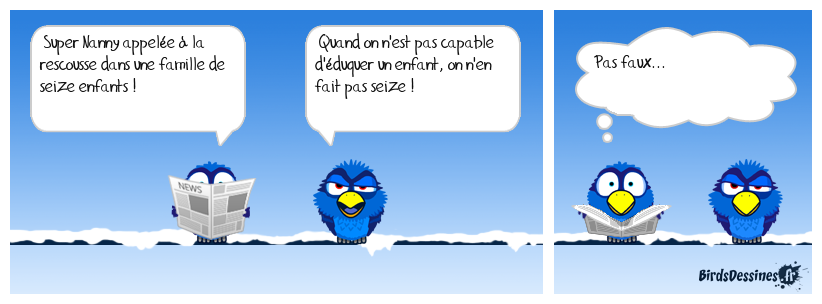 Case 1:Bird 1: Super Nanny appelée à la rescousse dans une famille de seize enfants ! | Case 2: Bird 1: Quand on n'est pas capable d'éduquer un enfant, on n'en fait pas seize ! | Case 3: Bird 1: Pas faux...
