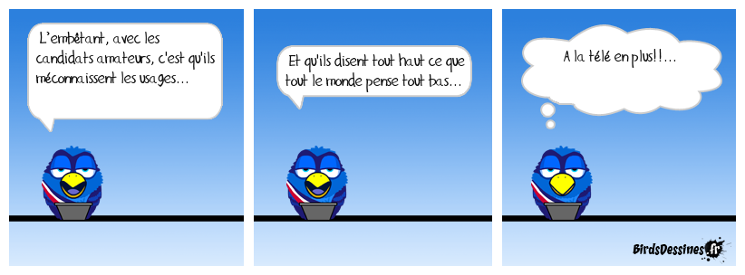 Case 1:Bird 1: L’embêtant, avec les candidats amateurs, c'est qu'ils méconnaissent les usages... | Case 2: Bird 1: Et qu'ils disent tout haut ce que tout le monde pense tout bas... | Case 3: Bird 1: A la télé en plus!!...