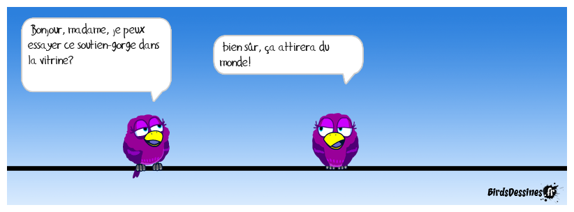 Case 1:Bird 1: Bonjour, madame, je peux essayer ce soutien-gorge dans la vitrine? | Case 2: Bird 1: bien sûr, ça attirera du monde! | Case 3: