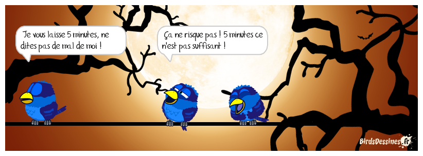 Case 1:Bird 1: Je vous laisse 5 minutes, ne dites pas de mal de moi ! | Case 2: Bird 1: Ça ne risque pas ! 5 minutes ce n'est pas suffisant ! | Case 3: