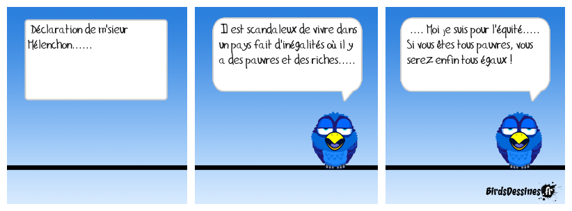 Case 1:Bird 1: Déclaration de m'sieur Mélenchon...... | Case 2: Bird 1: Il est scandaleux de vivre dans un pays fait d'inégalités où il y a des pauvres et des riches..... | Case 3: Bird 1: .... Moi je suis pour l'équité..... Si vous êtes tous pauvres, vous serez enfin tous égaux !